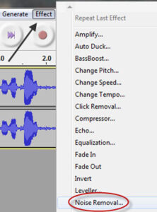 Việc bạn đang làm là chọn một mẫu âm thanh cho Audacity hiểu được mục tiêu của bạn. Tiếp theo, hãy chọn Effect, rồi chọn Noise Removal từ menu chính.