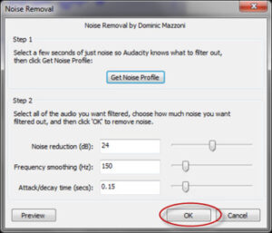 Tại đây, tốt nhất là bạn nên giữ nguyên các tùy chọn mặc định và chỉ cần nhấn nút OK. Khi quá trình hoàn tất, bạn sẽ thấy rằng Audacity đã làm phẳng những phần mờ của dạng sóng: