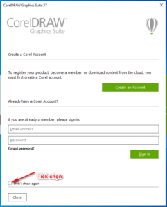 Bước 21: Chạy phần mềm Corel và tick chọn ở ô “Don’t show again”, sau đó nhấn nút Close