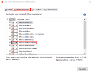 Tại mục “Installation Options“, bạn sẽ thấy danh sách các ứng dụng. Bỏ tích vào các ứng dụng như Microsoft SkyDrive Pro và Microsoft Lync nếu bạn không muốn cài đặt.