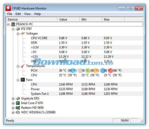 HWMonitor là một công cụ tuyệt vời có khả năng tương tác với hầu hết các loại chip cảm biến phổ biến như ITE IT87, Winbond ICs và nhiều loại khác nữa. Nó không chỉ đọc được các thông số nhiệt độ mà còn theo dõi nhiệt độ ổ cứng thông qua công nghệ S.M.A.R.T và card đồ họa GPU.