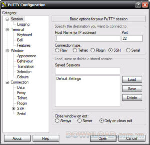 PuTTY mang đến cho bạn một bảng cấu hình dễ hiểu, giúp bạn tùy chỉnh và quản lý các phiên làm việc cũng như kết nối thiết bị đầu cuối. Bạn có thể dễ dàng chọn loại kết nối (Raw, Telnet, Rlogin, SSH và Serial), đồng thời thiết lập tùy chọn ghi nhật ký cho phiên làm việc hiện tại.
