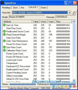 Hãy nhấn vào tab SMART, nếu ổ cứng của bạn hỗ trợ tính năng này, hãy chọn nó từ danh sách. Bạn sẽ thấy những thông tin mà SMART cung cấp, nhưng nếu không có kiến thức chuyên môn, có thể bạn sẽ khó hiểu được ý nghĩa của chúng. Điều quan trọng nhất bạn cần chú ý là hai cột Fitness (Độ bền HDD) và Performance (Hiệu năng). Nếu giá trị của hai cột này quá thấp, thì đã đến lúc bạn nên xem xét lại tình trạng ổ cứng của mình.