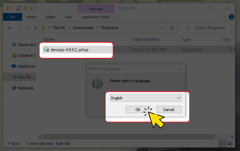 - Sau khi tải xong. Mở file cài đặt Dev C++. Lựa chọn tiếng Anh và xác nhận.