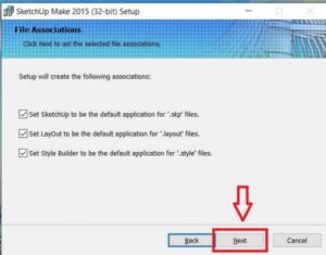 Bước 4: Ở bước này dùng để thiết lập cài đặt ban đầu cho Sketchup với những định dạng file “.skp”, “.layout”, ”.style”, lưu ý nhấn chọn những định dạng bạn cần, nhấn Next qua bước tiếp theo.